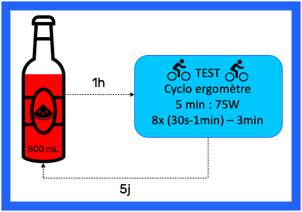 Tous les 5 jours, les participants avaient un test sur ergomètre en ayant bu 1h avant un jus de pastèque naturel (contenant 1.17g de citrulline), un jus de pastèque enrichi (contenant 6g de citrulline) ou un placebo couleur jus de pastèque.