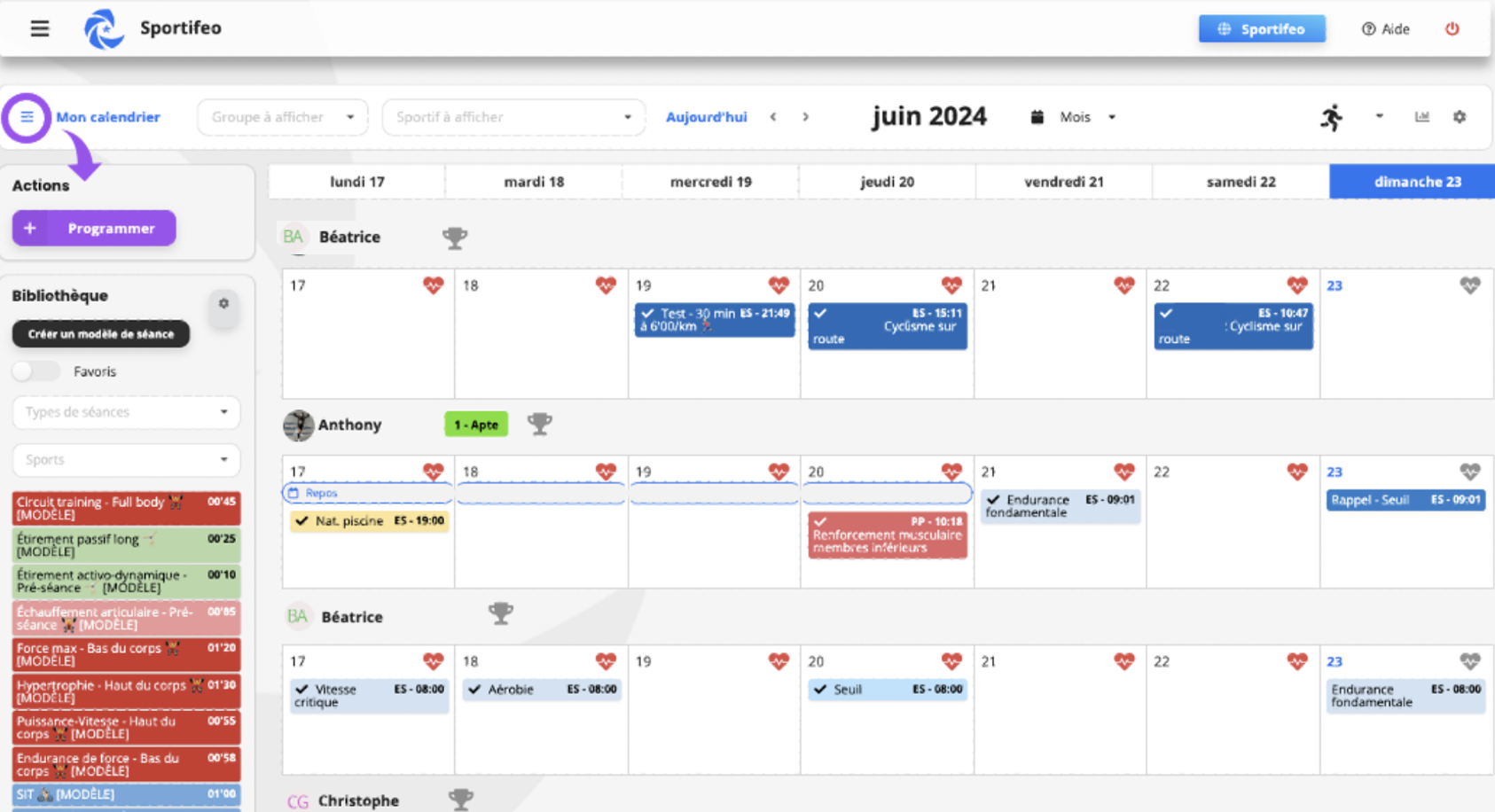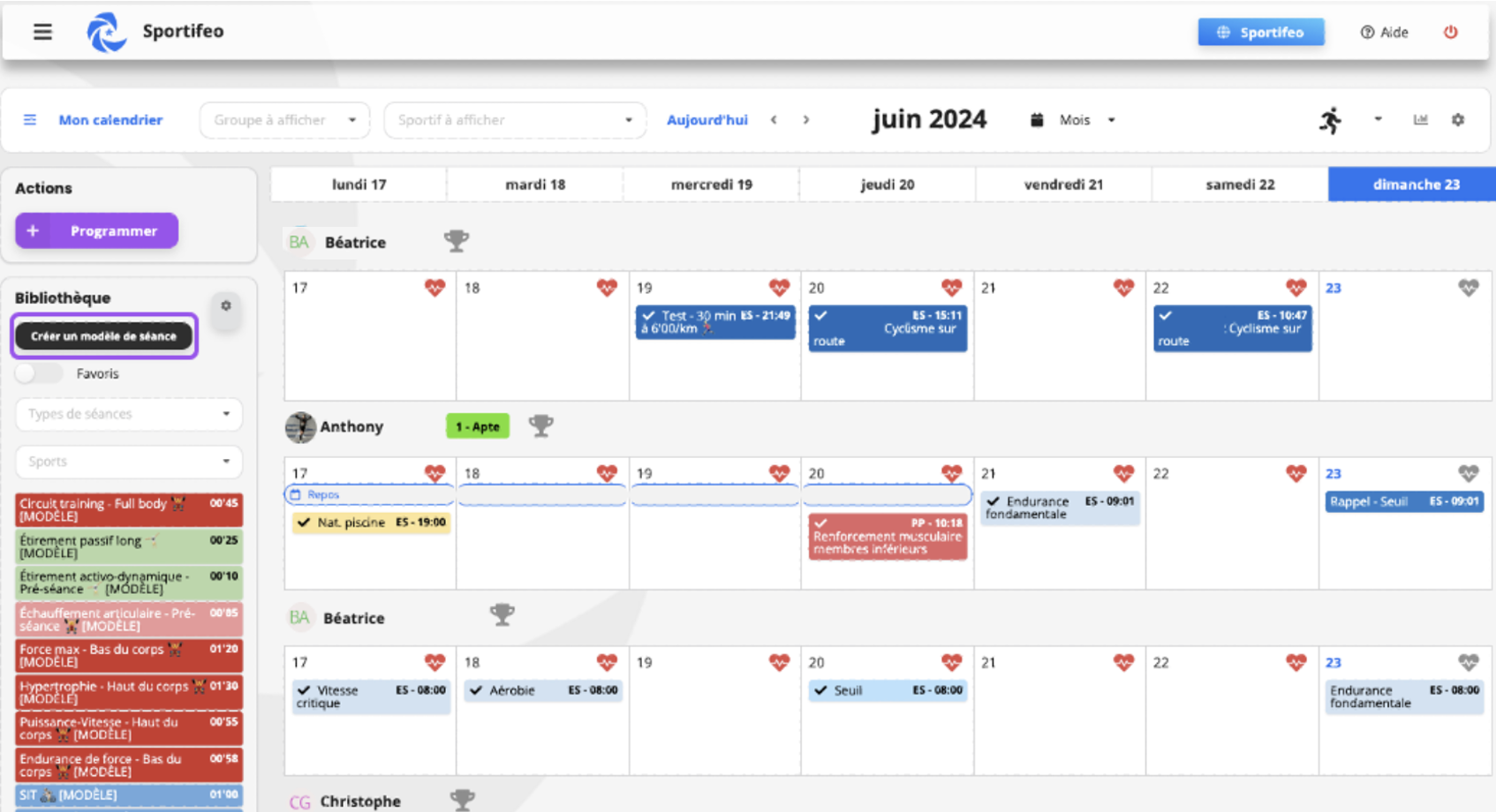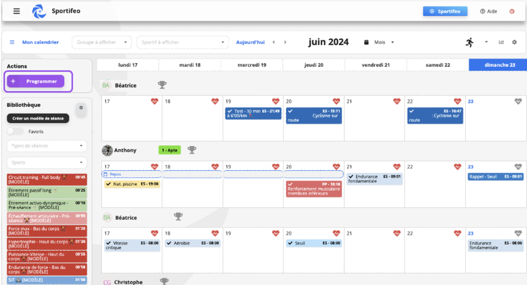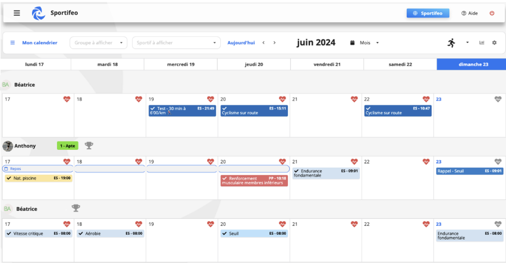 Toutes les séances que vous avez planifié pour la semaine pour tous vos sportifs apparaissent.